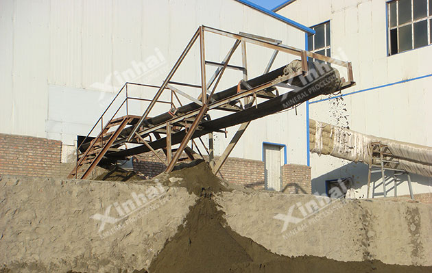 尾礦經(jīng)渣漿泵輸送到水力旋流器進(jìn)行濃縮和分級,水力旋流器的沉砂進(jìn)入高頻高效脫水篩進(jìn)行脫水處理,溢流則進(jìn)入高效化改造濃密機(jī)進(jìn)行濃縮處理。經(jīng)高頻高效脫水篩處理過后的粗粒尾礦經(jīng)皮帶運(yùn)輸機(jī)運(yùn)輸?shù)搅蠄龆汛妗F渲,?jīng)高效化改造濃縮機(jī)濃縮處理過后的尾礦由渣漿泵輸送到廂式壓濾機(jī)進(jìn)行壓濾處理,壓濾機(jī)的濾餅自卸到皮帶運(yùn)輸機(jī)上,把細(xì)粒尾礦運(yùn)輸?shù)搅蠄龆汛妗?/p>