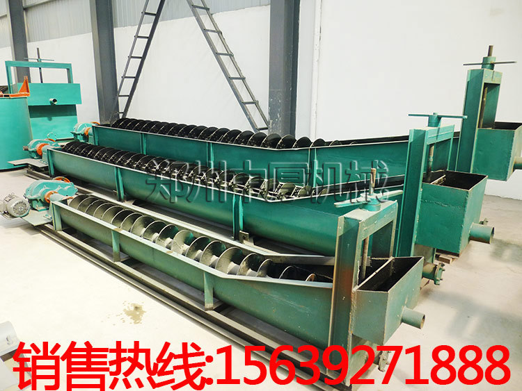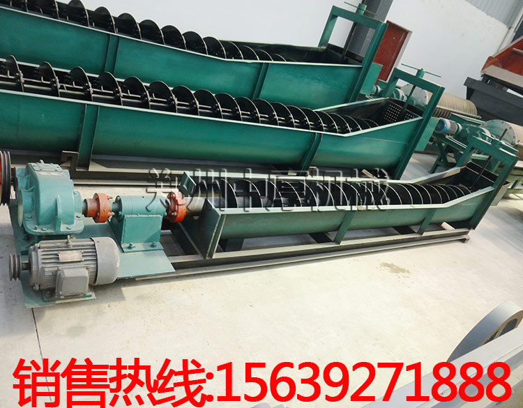 螺旋分級機(jī)在選礦廠用于同磨礦機(jī)組成閉路的分級機(jī),其結(jié)構(gòu)簡單,工作平穩(wěn),操作方便,返砂含水量低,便于與磨機(jī)自流返砂,常用于濕式磨礦作業(yè)的預(yù)先分級、控制分級。主要分為高堰式單螺旋和雙螺旋,沉沒式單螺旋和雙螺旋。按分級液面的高低可分為高堰式和侵入式(或沉沒式)兩種。高堰式分級機(jī)的溢流高于下端螺旋軸的中心,而低于螺旋葉片的上緣。分級液面長度不大,液面可直接感受到螺旋葉上攪動作用,故適于粗粒級分級作用,分級粒度多在0.15mm(100目)以上。侵入式(沉沒式)分級機(jī)的下端螺旋葉片完全侵入在液面以上,分級面積大而又平穩(wěn),適于細(xì)粒級分級,分級粒度在0.15mm(100目)以下。它的溢流生產(chǎn)率高。此外,還有一種低堰式分級機(jī),其分級液面低于下端螺旋軸承,液面很小,攪動作用大,主要用于含泥礦石的洗礦。