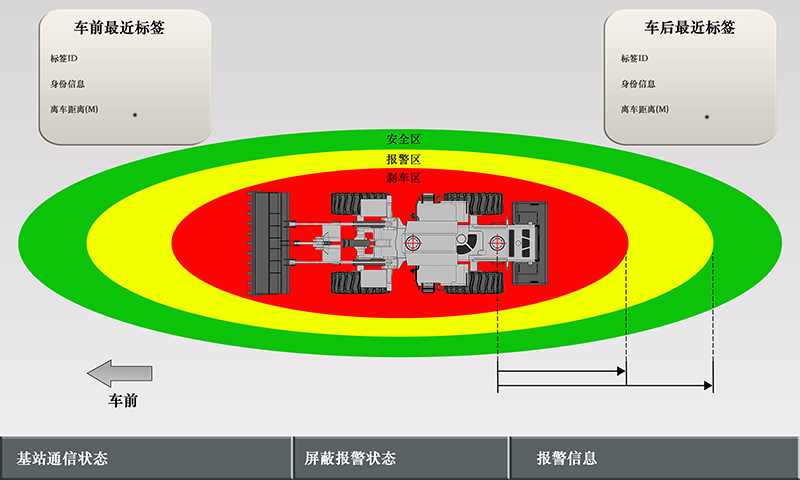 6 剎車區(qū)為碰撞預(yù)警,通過高精度射頻定位識(shí)別技術(shù),測(cè)定相對(duì)距離。