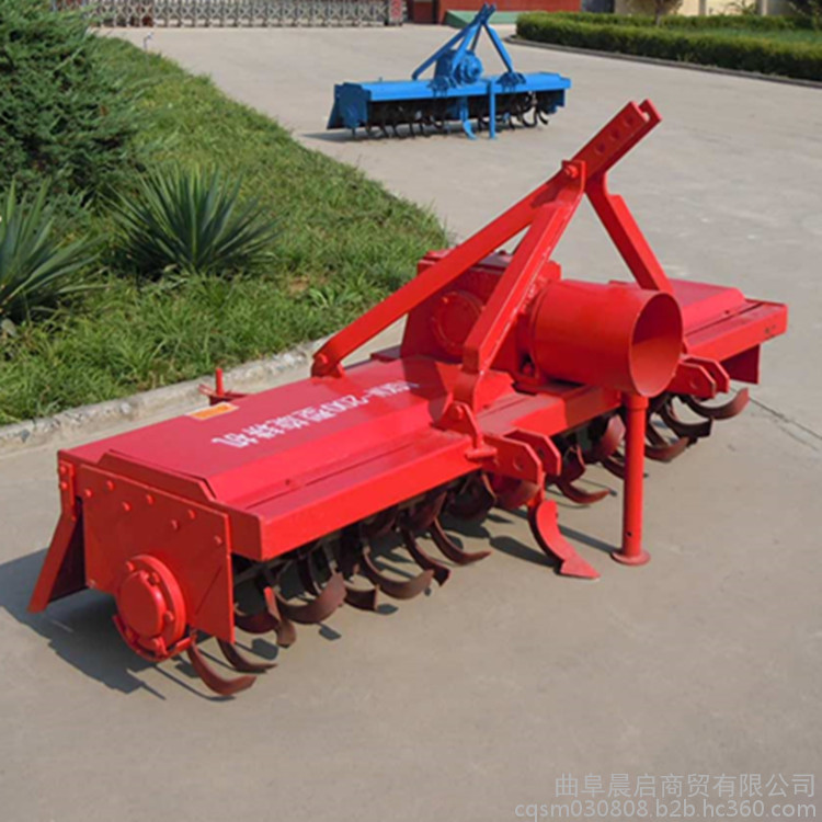 該旋耕機(jī)采用三點(diǎn)懸掛式、萬向節(jié)傳動,以旋轉(zhuǎn)刀齒為工作部件的驅(qū)動型土壤耕作機(jī)械,又稱旋轉(zhuǎn)耕耘機(jī),有較強(qiáng)的碎土能力,一次作業(yè)即能使土壤細(xì)碎,土肥摻和均勻,地面平整,達(dá)到旱地播種或水田栽插的要求,有利于爭取農(nóng)時,提高工效,并能充分利用拖拉機(jī)的功率。工作部件包括旋耕刀輥和按多頭螺線均勻配置的若干把切土刀片,刀輥的旋轉(zhuǎn)方向通常與拖拉機(jī)輪子轉(zhuǎn)動的方向一致。切土刀片由前向后切削土層,并將土塊向后上方拋到罩殼和拖板上,使之進(jìn)一步破碎。